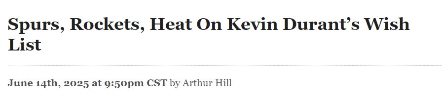 北京时间6月15日,The Athletic名记Sam Amick报道称,马刺和火箭是杜兰特的首选目的地,但他希望去圣安东尼奥或休斯敦并不意味着他最终会去这两个城市中的一个,因为这两支球队都存在“复杂因素”,使得交易难以达成。
